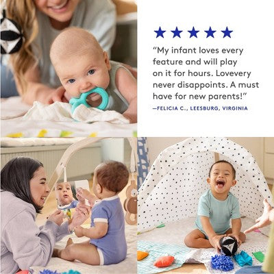 Duża mata do leżenia na brzuszku i pleckach z kilkoma strefami rozwoju: kontrast, faktury, dźwięki i lusterko. Dołączone zabawki można przepinać, dzięki czemu maluch ma zawsze coś nowego do odkrycia. Solidne pałąki oraz możliwość późniejszego zrobienia namiotu sprawiają, że mata posłuży dłużej niż standardowe modele.